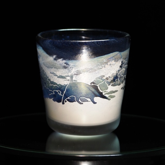雲渡り猫+ウロコカット/松葉色(廃盤色) φ85mm×H80mm 完成品の為入金日より5日以内で発送が可能です。 数年前に宙吹きで雪冠+蒼の銀河でで作ったきりの生地に、最近になって雲渡り猫のデザインを砂彫刻(#サンドブラスト)で彫り込みました。 いつもは全部蒼の銀河状態にするのですが、敢えて銀箔を残しつつも蒼に変化する様が分かる状態で止め、猫モチーフを彫り込み、艶出しをしました。 猫デザインは勿論ですが宙吹きから砂彫刻(サンドブラスト)に至るまで可夜自身が手がけ生み出された逸品です。 光に当たることで幻想的な蒼のダイヤモンドダストが浮かび上がります。 年間を通した制作の中で作られる一点ものはごく僅かです。 伊勢丹新宿店にて年始用の目玉作品として用意したものですが、期間限定で今回クリスマス用に通販掲載します。