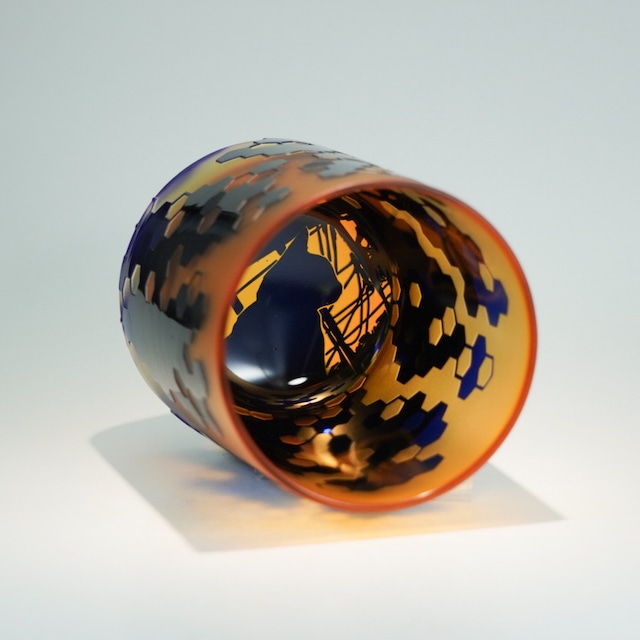 こちらの作品は可夜考案の創作グラスです。 新たな試みとしてサンドブラストとカット(切子)を組み合わせたグラスが誕生しました。 ぼかしという高度なテクニックでグラデーションを表現しています。 真上から覗くと蓮の華のように見えます。 【分類】 サンドブラスト+カット 【個数 】1個 【サイズ】口部φ75mm×H90mm 【納期 】5日(入金日より) 【技法】砂彫刻、切子カット 【色 】瑠璃+オレンジ 【仕上げ】つや消しマット特別仕上げ