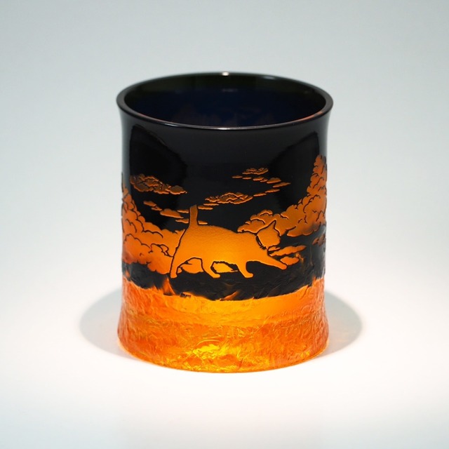 【分類】 猫硝子 【ガラス】国産 【個数 】1個 【サイズ】口部φ75mm×H90mm 【技法】砂彫刻 【納期】30日(入金日より) ・一日千秋 窓辺でご主人の帰りを待ち侘びている猫の後姿と向こう側に透けて見える満月。 一日が千年にも感じられるさまを指す言葉から想像を膨らまし、生まれた作品です。どこか切なく物語を感じるこの作品は多くの猫好きの心を射止めています。 数ある作品の中でも一際人気があり、派生作品は3種御座います。 (一日千春・一日千桜・一日千夏) ・いちじつ-せんしゅう【一日千秋】の意味・使い方 出典:新明解四字熟語辞典(三省堂) 非常に待ち遠しいことのたとえ。ある物事や、人が早く来てほしいと願う情が非常に強いこと。一日が千年にも長く思われる意から。▽「千秋」は千年の意。「日」は「にち」とも読む。 彫刻による色の表現なので割れない限り永久に形を保ちます。 ・夕焼け色(瑠璃+オレンジ) 可夜硝子の代表色でもある瑠璃とオレンジのガラス。 夕焼け色のようなオレンジ色はまだ個人の作家がこの特別な色を扱える時代では無かったものでした。粘り強く交渉し続けて数年、ようやく認めて貰った経緯があります。瑠璃オレンジから始まり、国内で先駆けて様々な色の組み合せに挑戦し続けている姿勢こそが可夜硝子の強みでもあると思っています。 ・満月の位置が二種類ある理由 背面満月(α)は窓で佇んでいる猫を見ながら向こうに透けて見える満月が魅力です。飾る機会が多い方は、こちらをオススメします。 底面満月(β)は底面に満月を彫ることで前者に比べて一際明るくなっています。 底面に被さっている瑠璃を彫りぬく事でこのような効果が生まれます。 グラスに注いだ飲み物を呑み干した時、光が底の満月部分を透過するので、器が燦燦と輝きを放ちます。使って(呑んで)頂いて初めて見える景色も御座います。 グラスを使われる機会が多い方はこちらをオススメします。 どちらもそれぞれの良さがあり悩まれている方は両方の購入をオススメします。見比べて飲むのも愉しくなりますよ。 中秋の名月にピッタリな器です。 素敵な一時となるよう願っています。