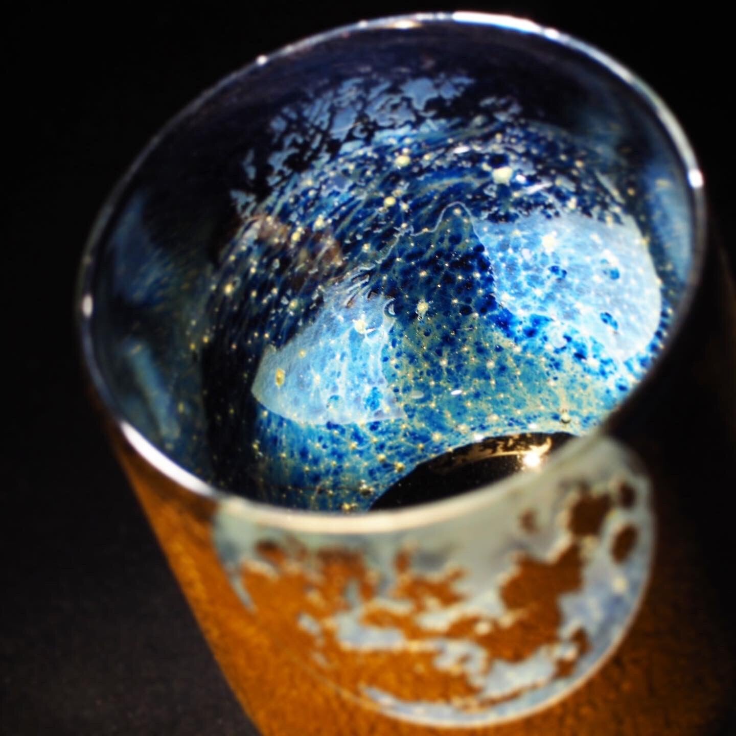 金箔の10倍の厚みを持った金澄(きんずみ)を器の外側に、宇宙を思わせる幻想的な蒼を内側にあしらいました。この幻想的な蒼は難易度の高い技法である銀耀変を用いて発現させています。