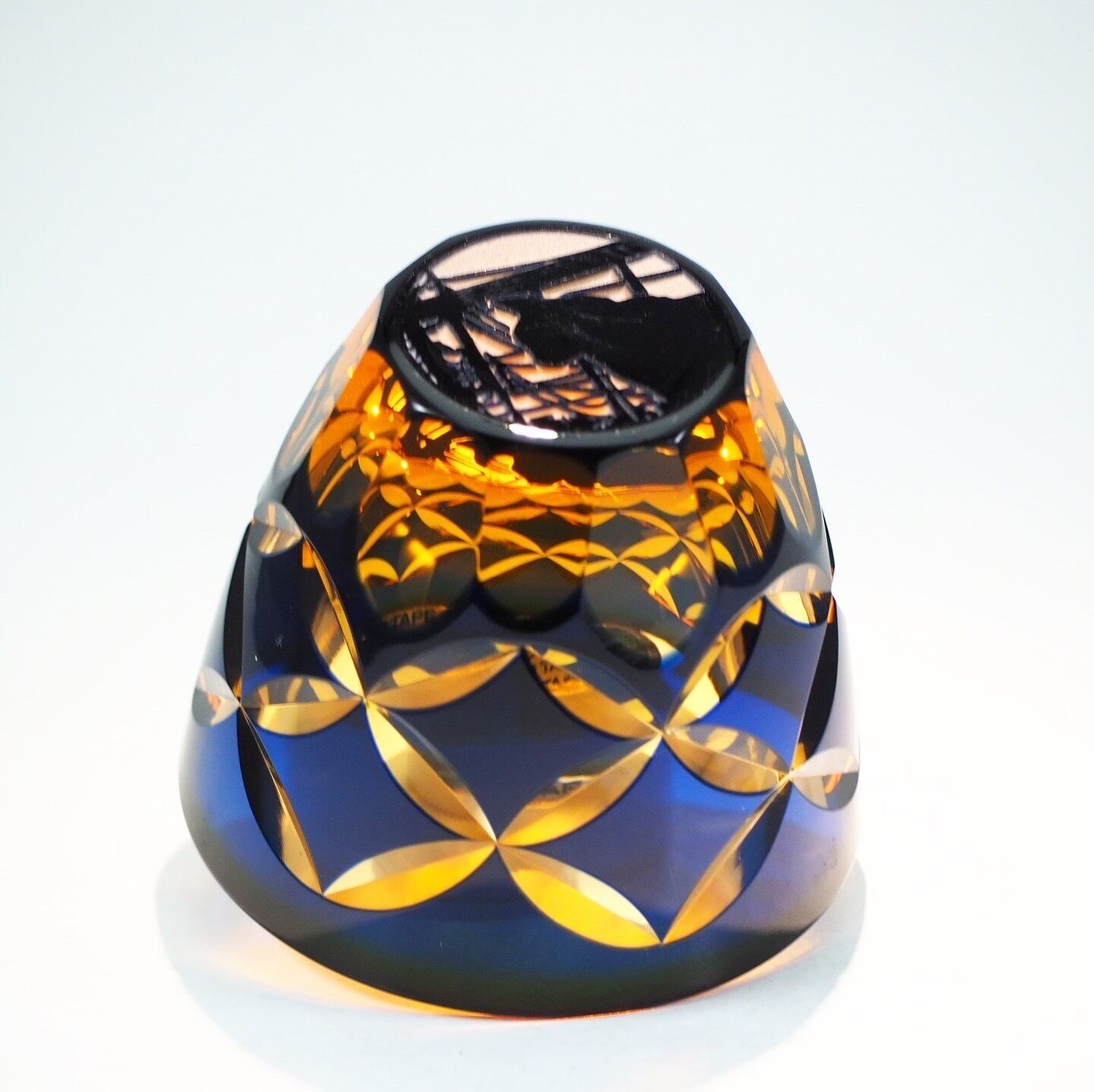このぐい呑みの最大の魅力は水鏡仕上げと呼ばれる独自のデザイン。底面を大胆に色を抜いて鏡面磨きをする事で切子の輝きがより増す仕掛けになっている。