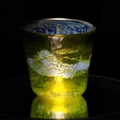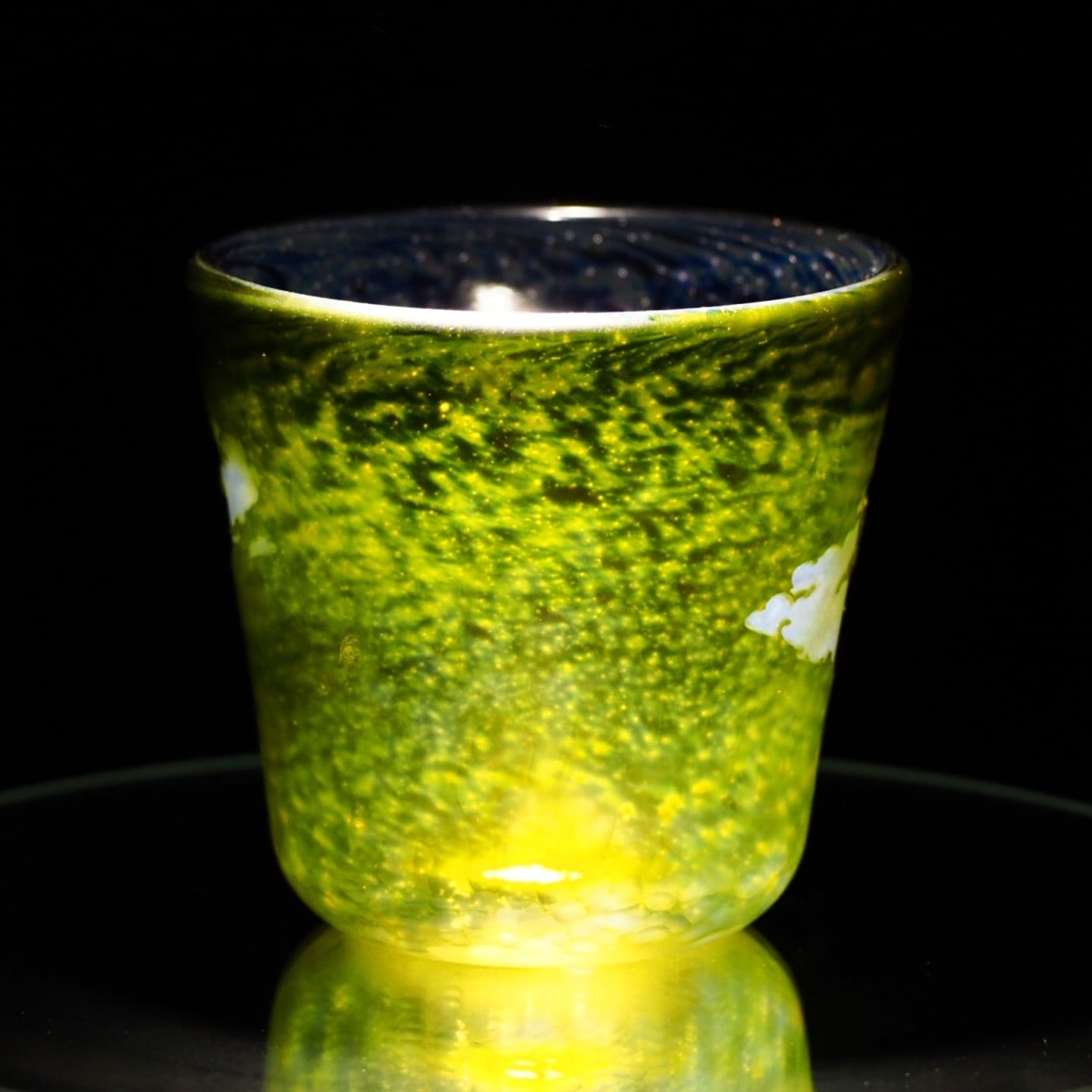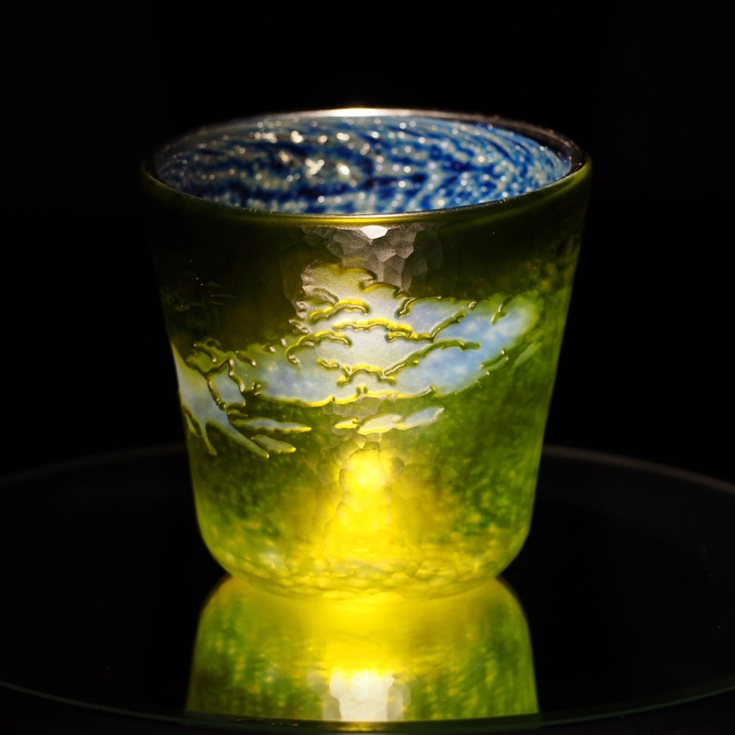 数年前に宙吹きで蒼のダイヤモンドダスト+外被せで作ったきりの生地に、最近になって雲渡り猫のデザインを砂彫刻(#サンドブラスト)で彫り込みました。