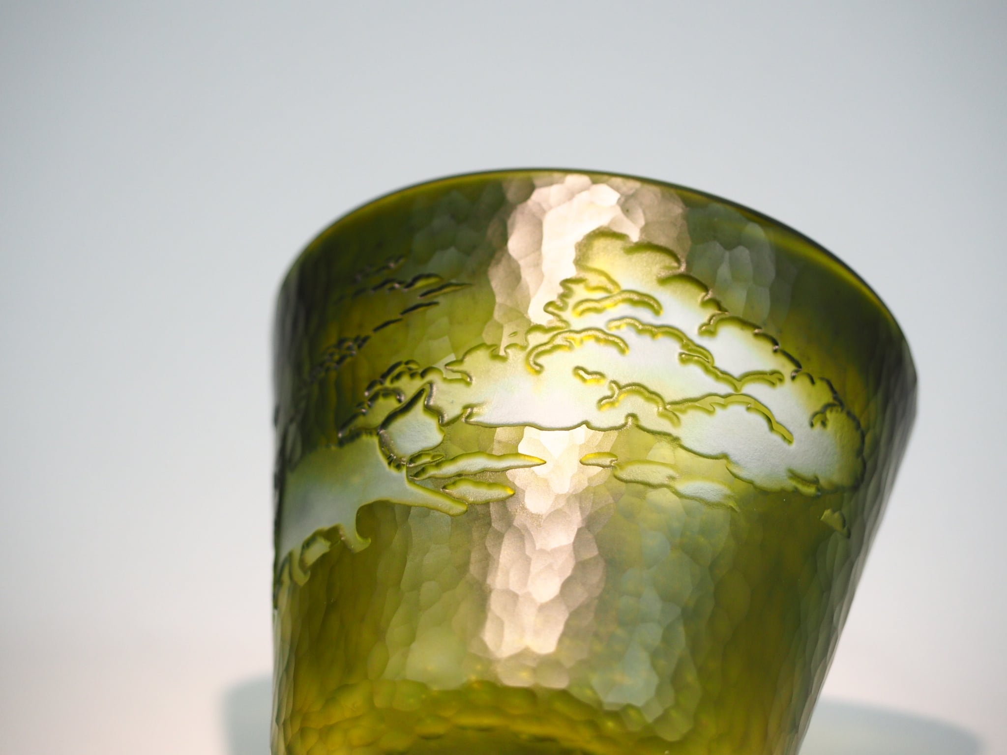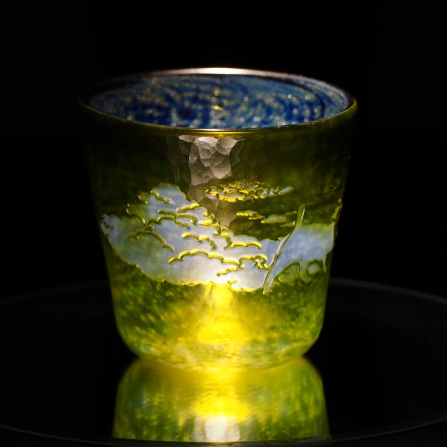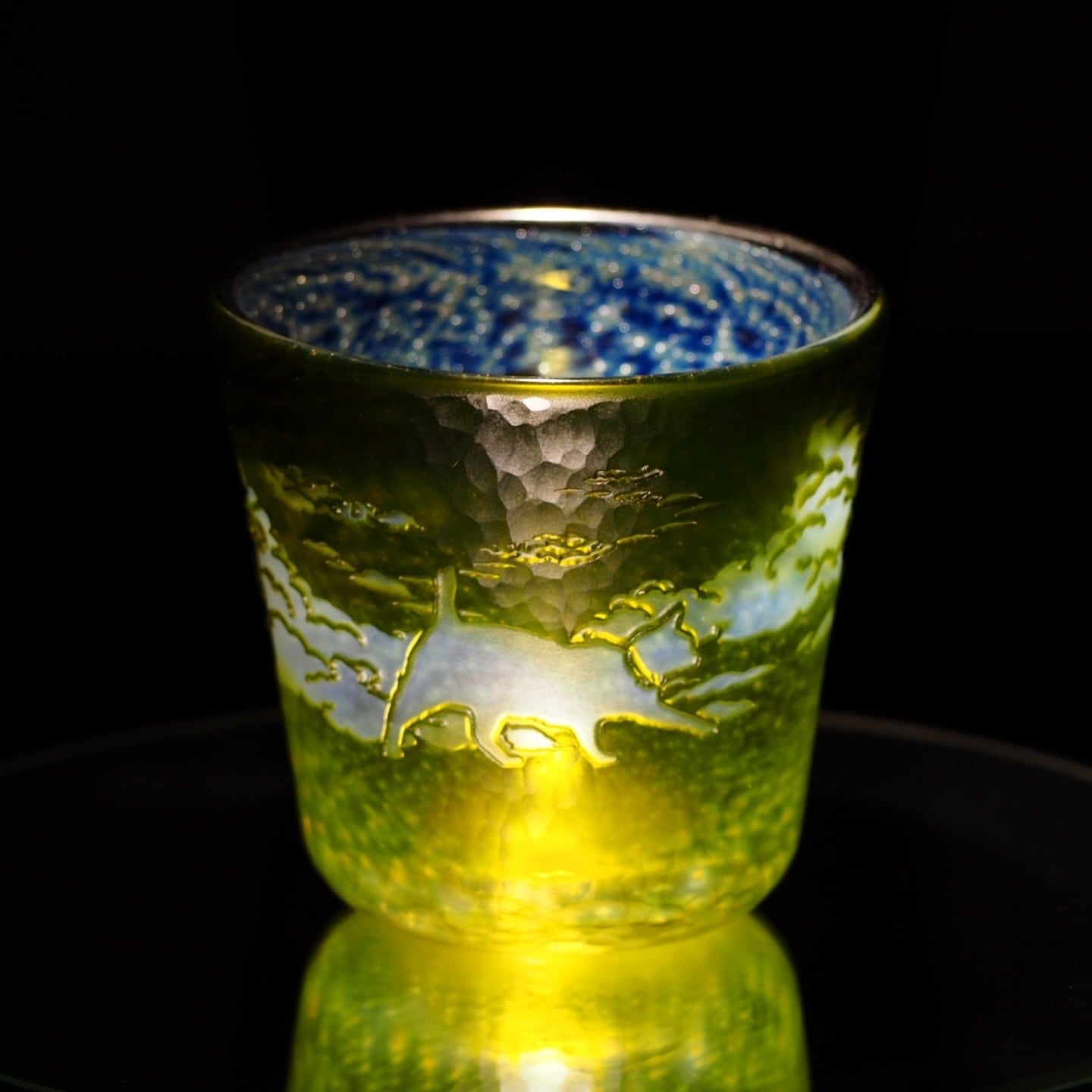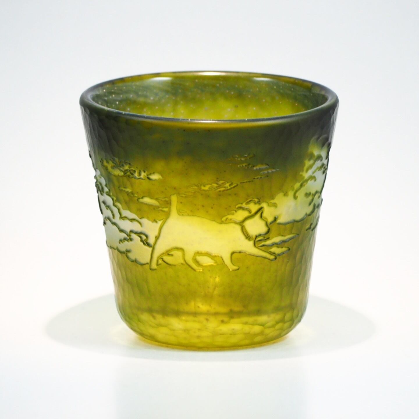 猫デザインは勿論ですが宙吹きから砂彫刻(サンドブラスト)、カットに至る3つの技法を可夜自身で手がけ生み出された逸品です。