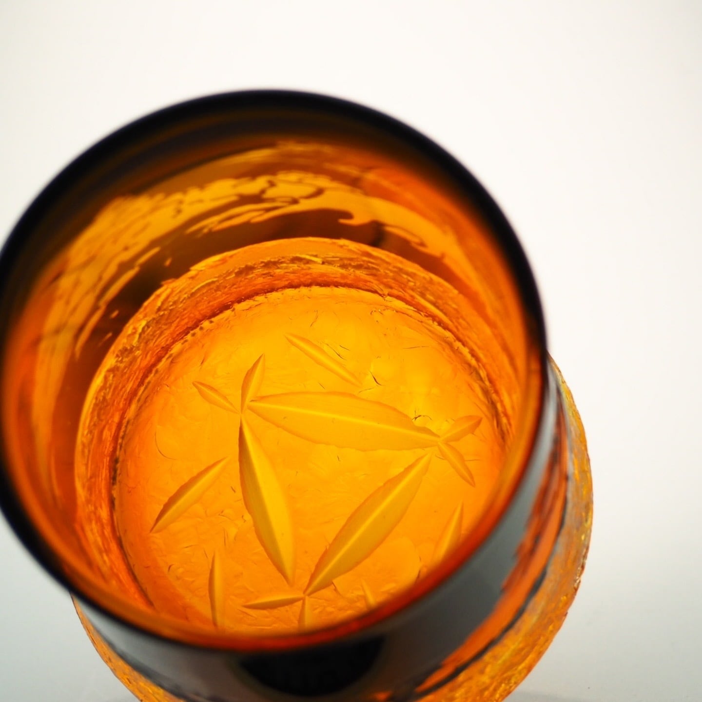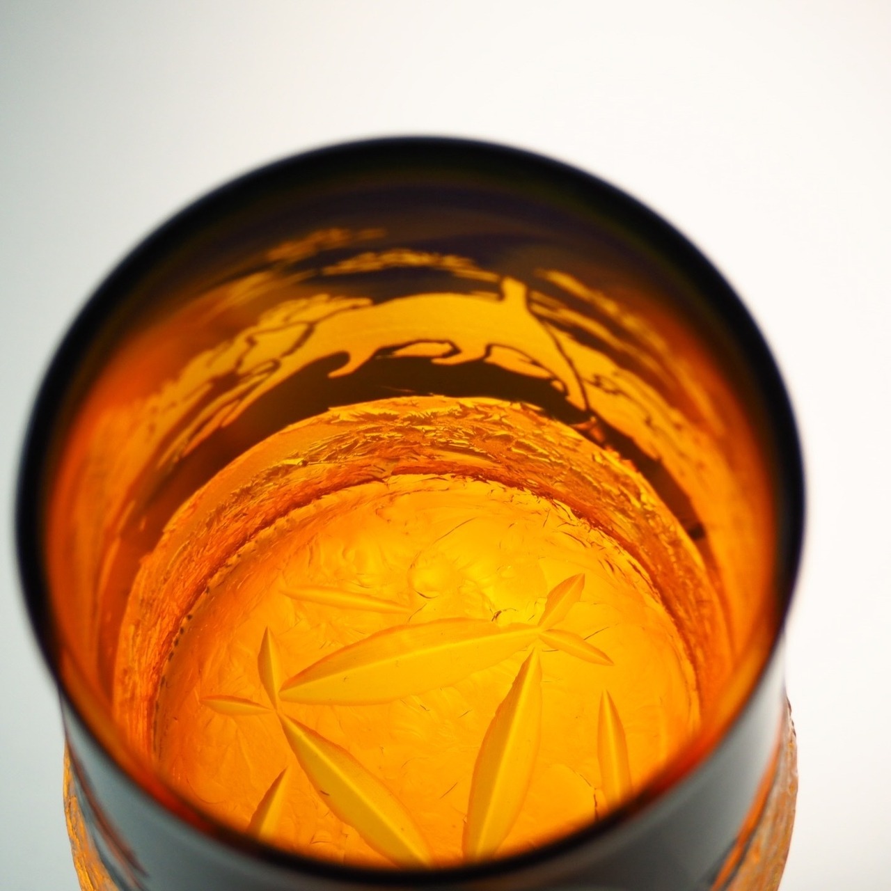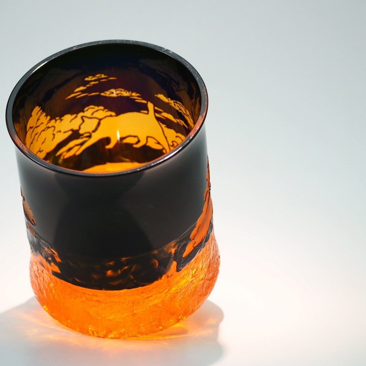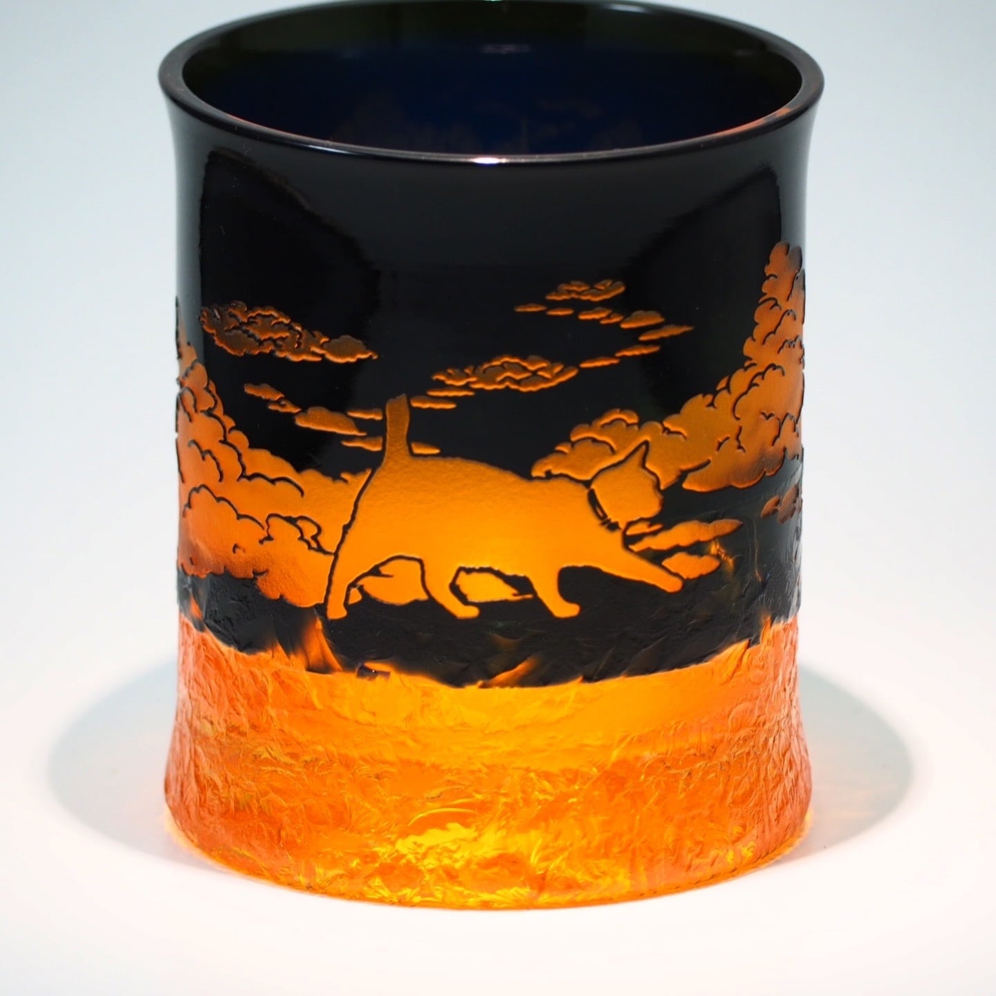 型吹きで作られた希少な瑠璃オレンジのガラスに猫と魚を詰め込みました。