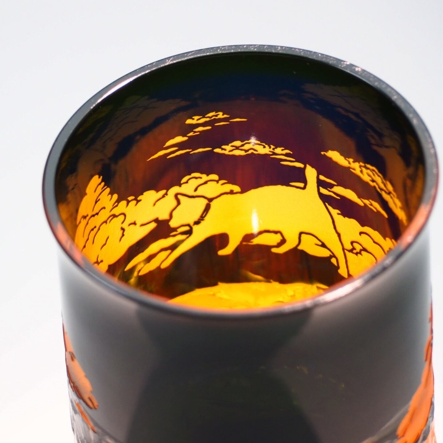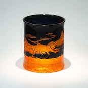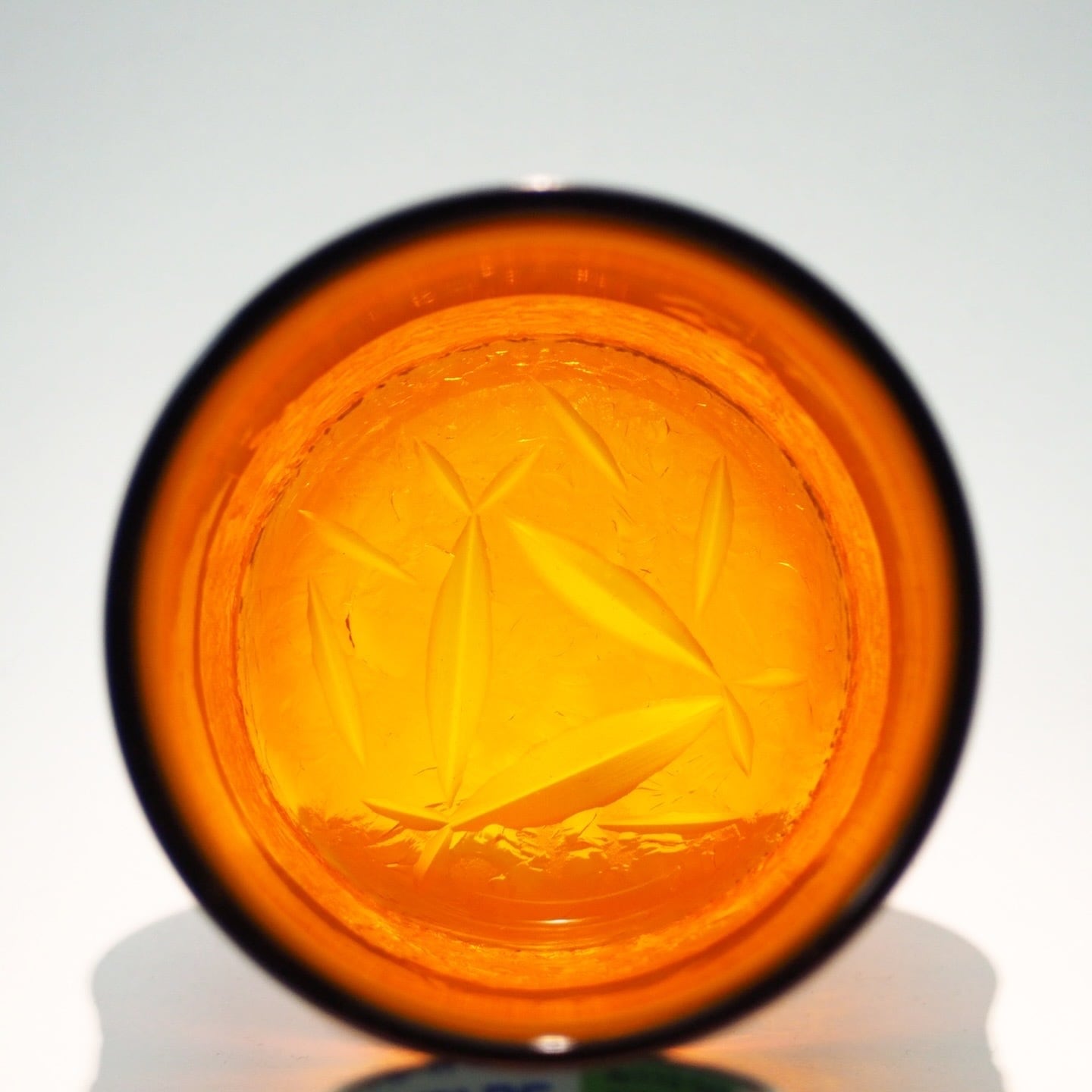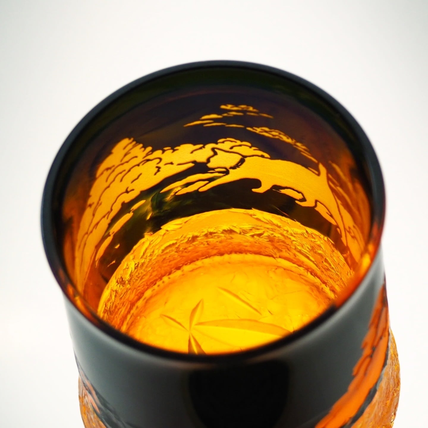 型吹きで作られた希少な瑠璃オレンジのガラスに猫と魚を詰め込みました。
