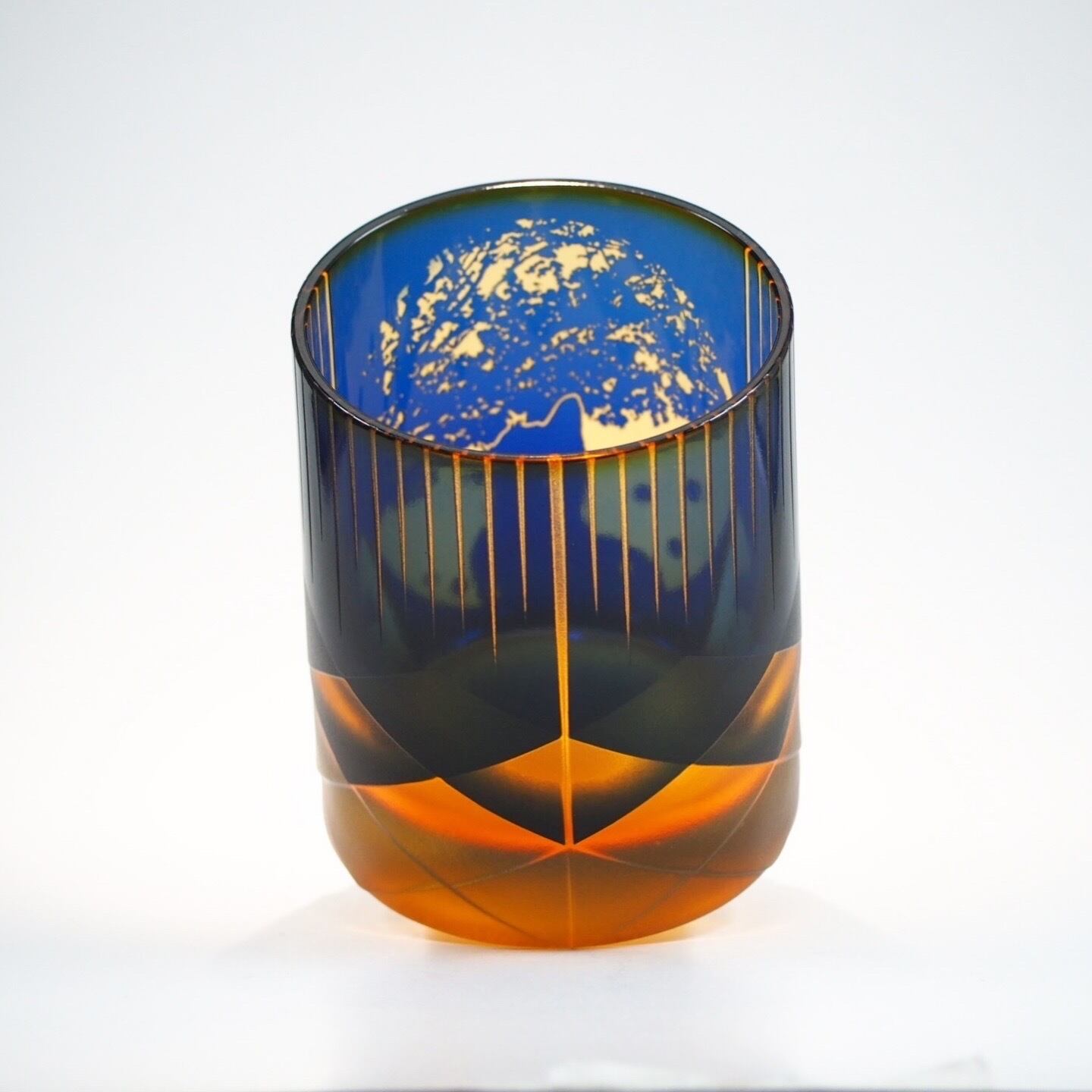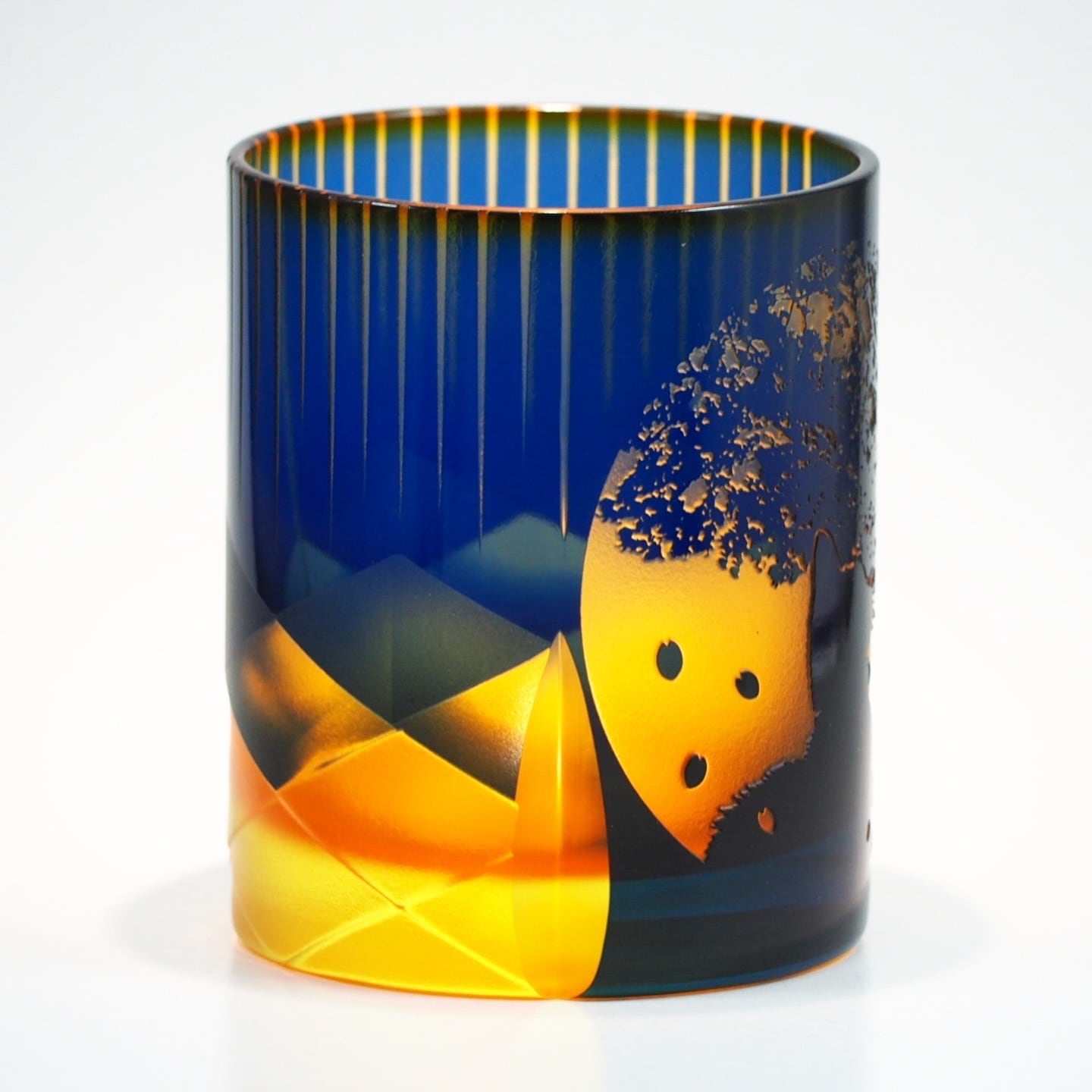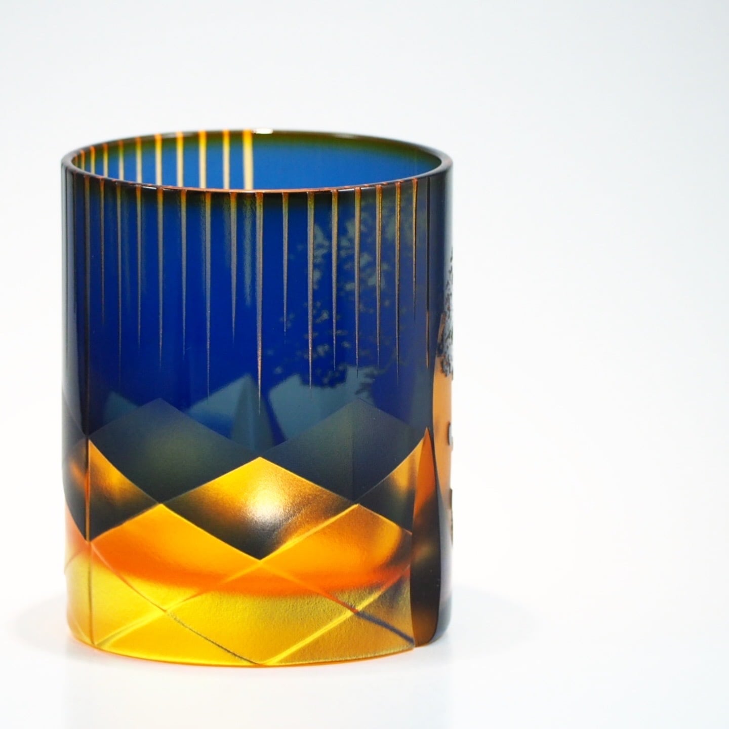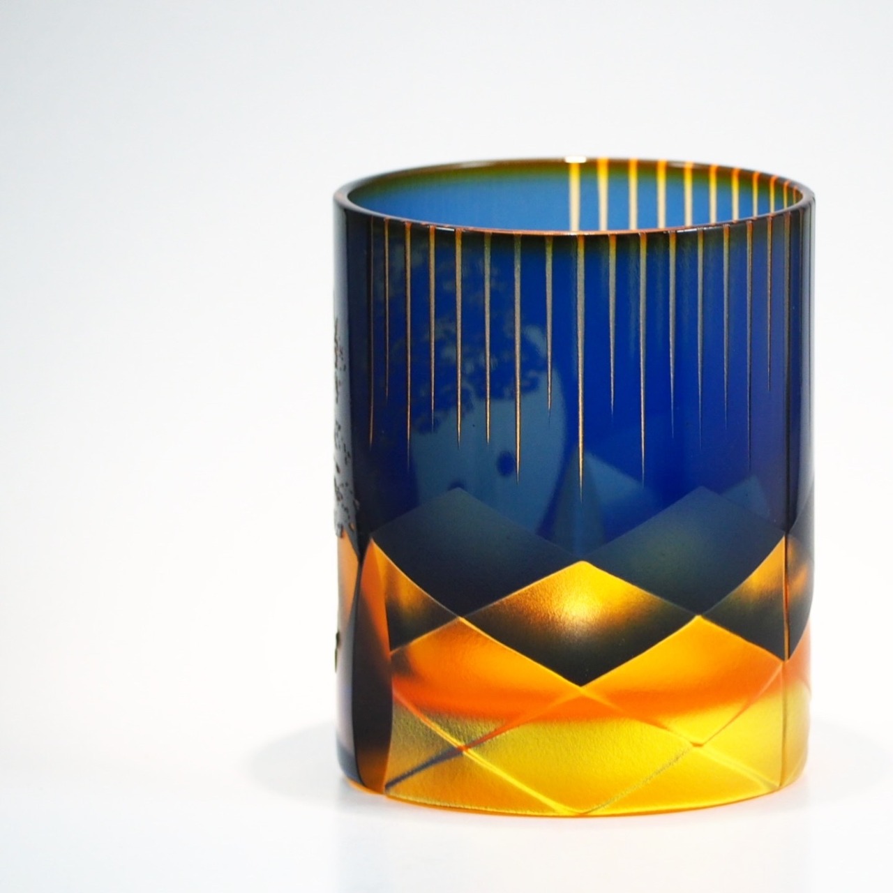 蓮華をイメージして、砂彫刻で多段彫りとグラデーションを器の下部にあしらいました。可夜自身でカットを散りばめ、特別仕上げを施す事で立体的で美しいグラスとなりました。