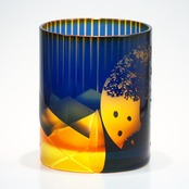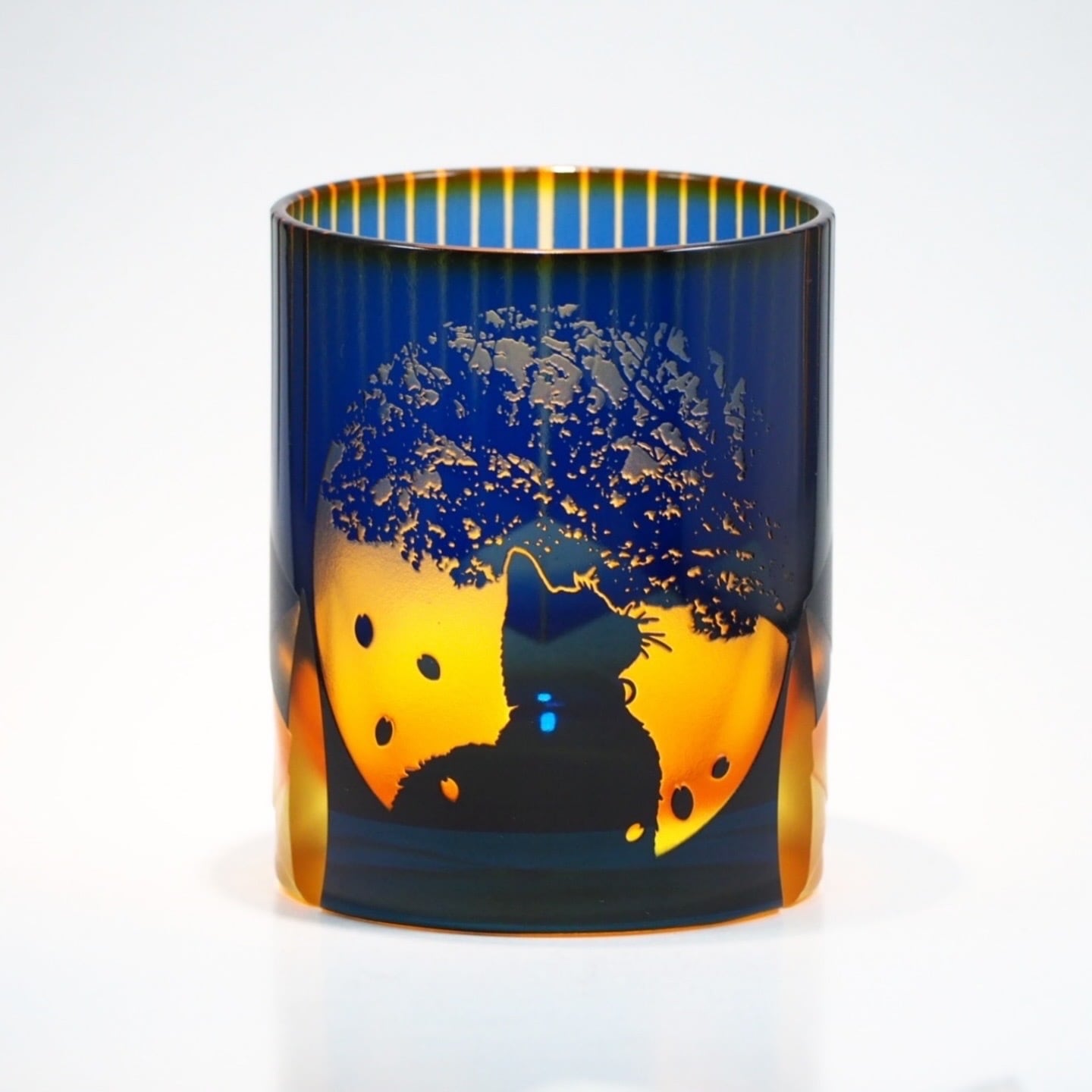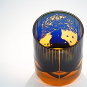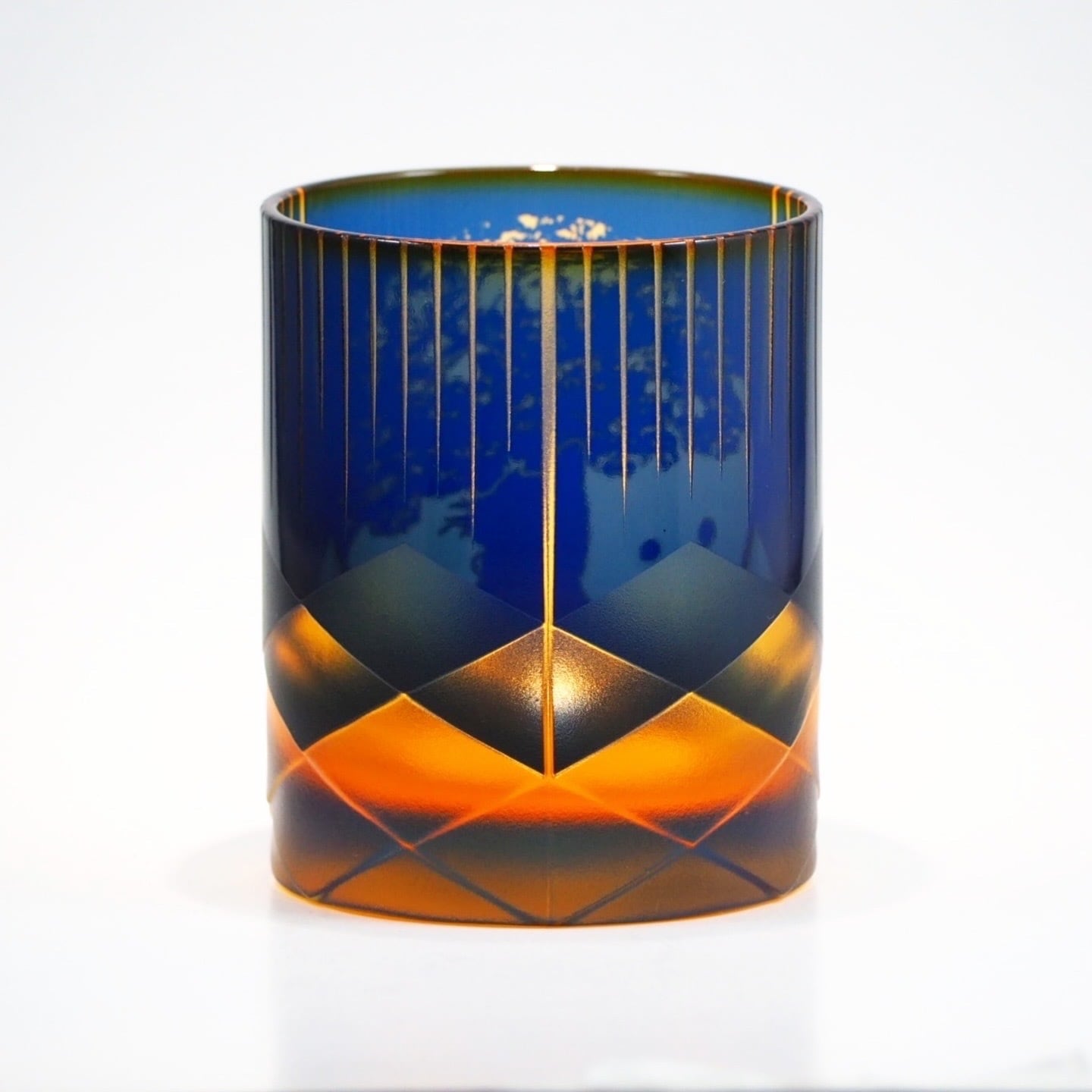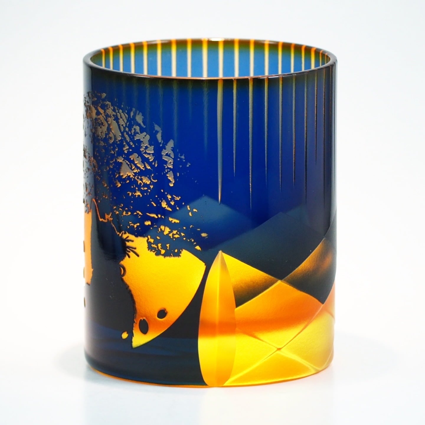 蓮華をイメージして、砂彫刻で多段彫りとグラデーションを器の下部にあしらいました。可夜自身でカットを散りばめ、特別仕上げを施す事で立体的で美しいグラスとなりました。