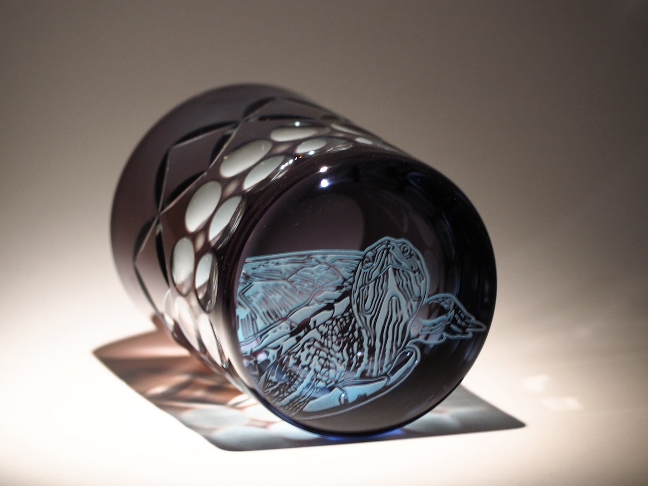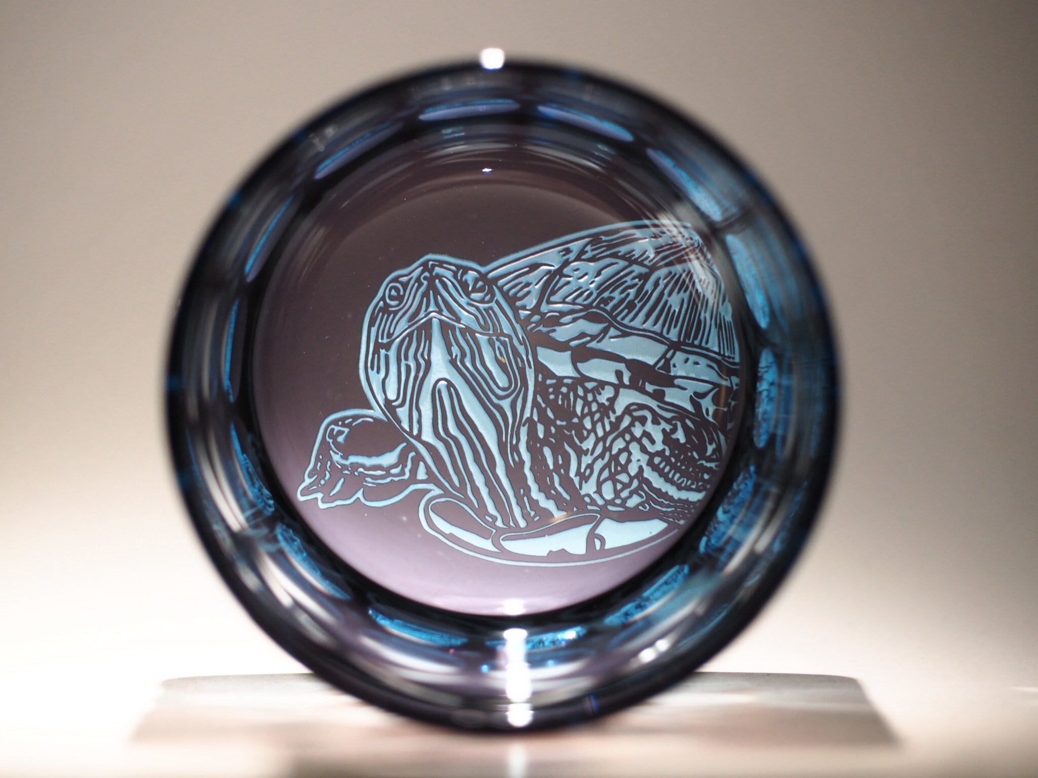 底面に砂彫刻で亀が彫られた『亀切子』です。