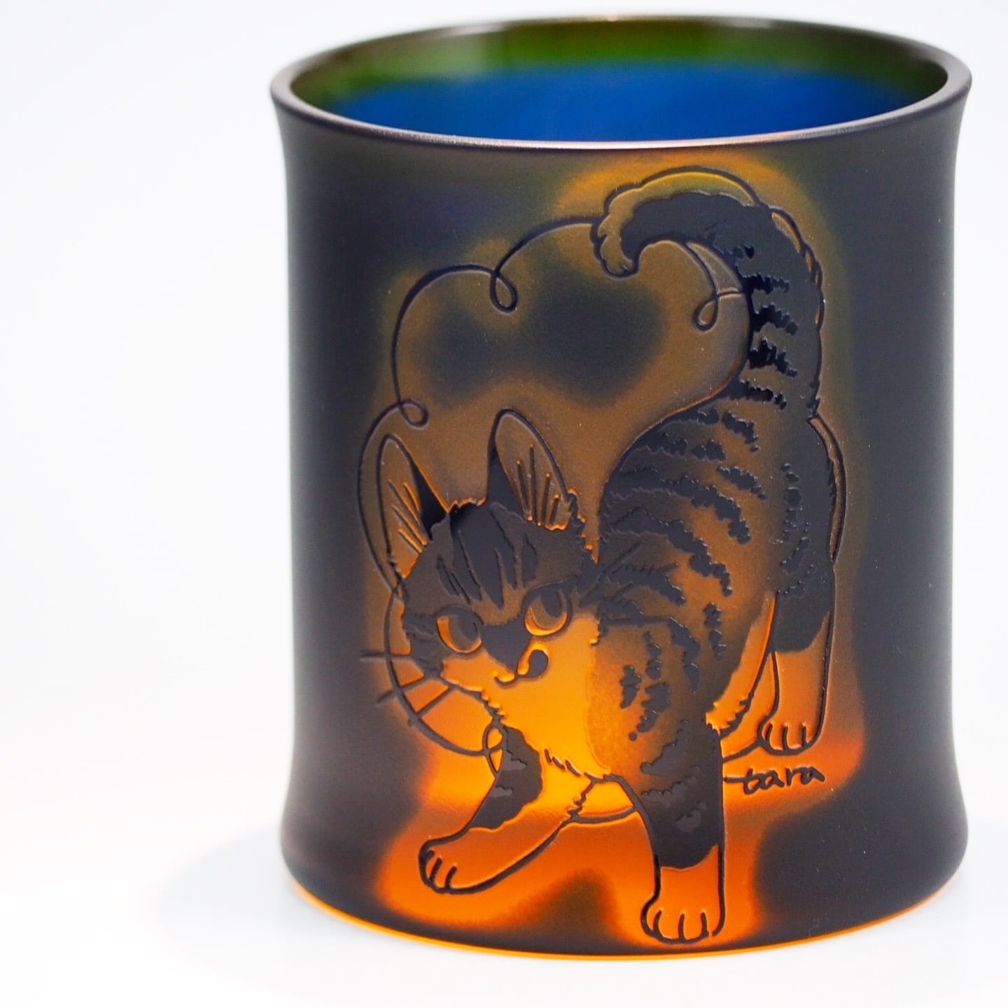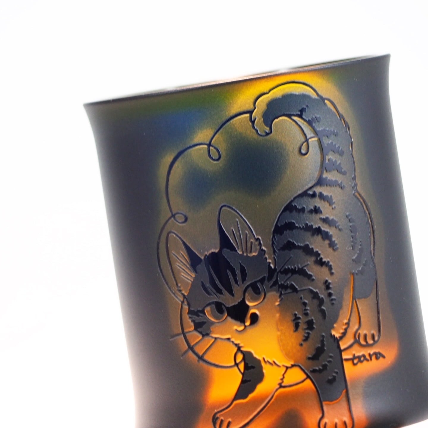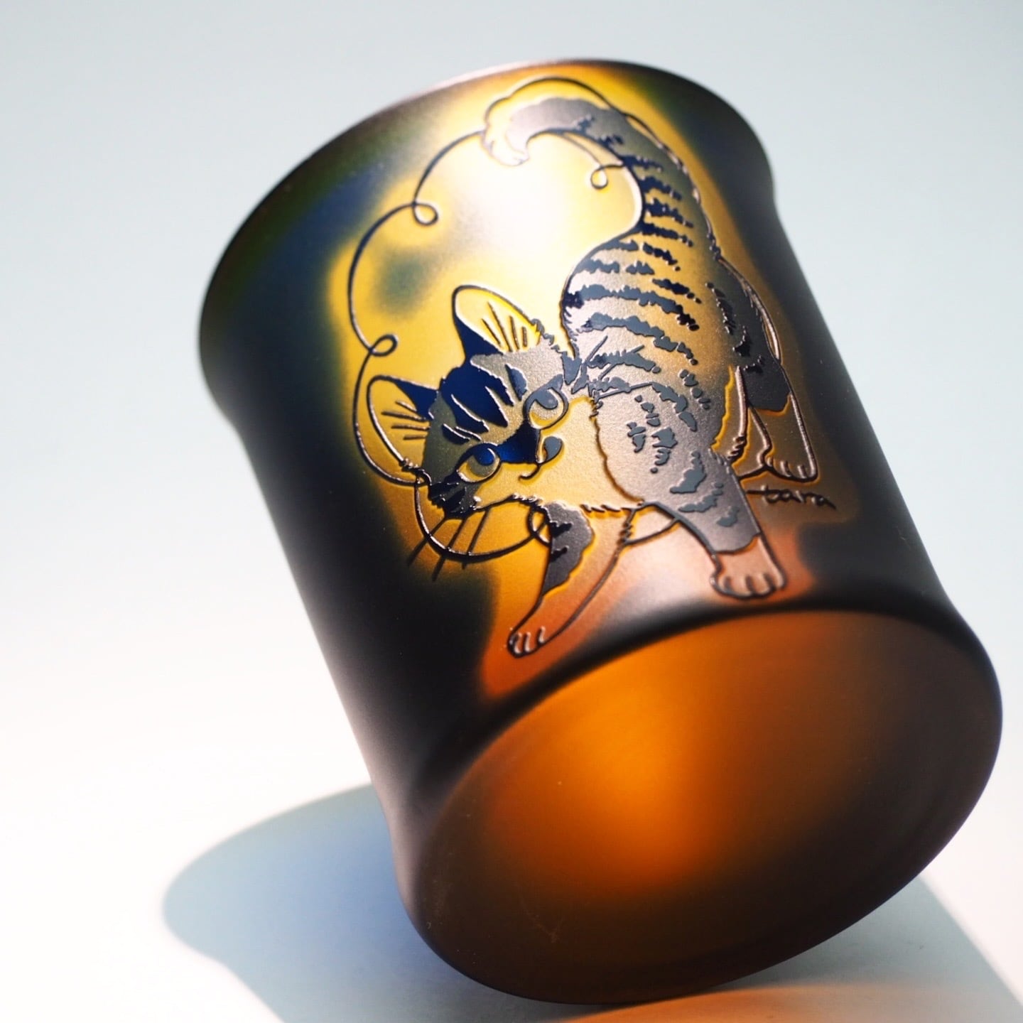 浅い彫り・中間の彫り・深い彫りの3層を組み合わせることで、従来の2色ガラス(今回はオレンジガラス+瑠璃被せ)だけで、まるで錦絵の「淡墨のぼかし」を思わせる柔らかく溶け合う階調と、奥行きのある質感を描き出すことが可能になりました。