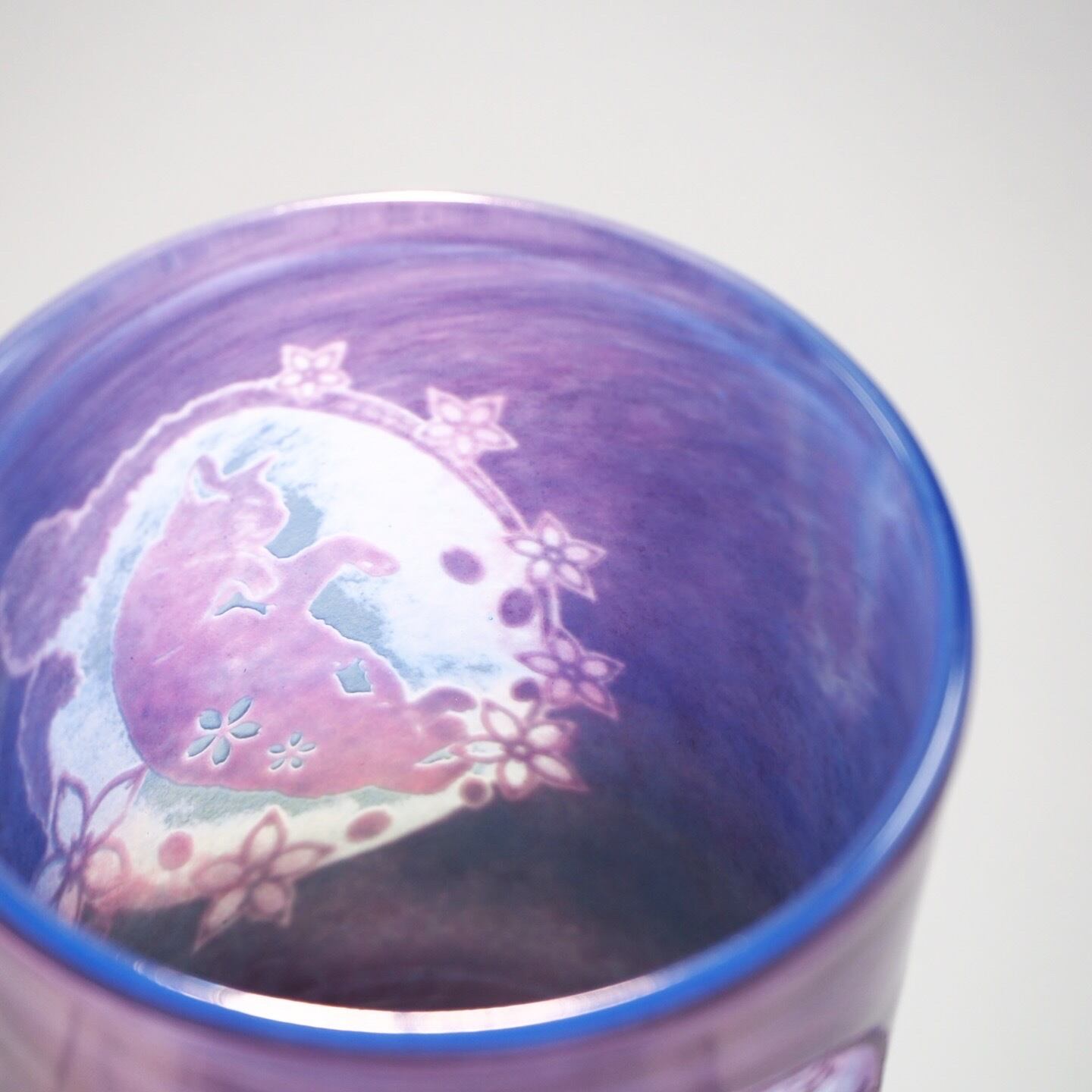 【色 】多層パウダー被せ・・・数色のガラスパウダーを重ね、彫刻の深さによって色が変わる。