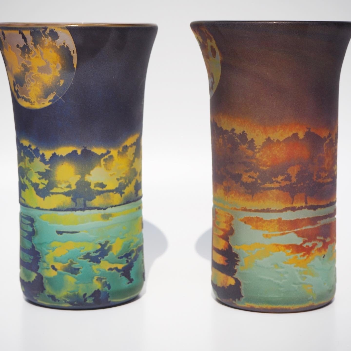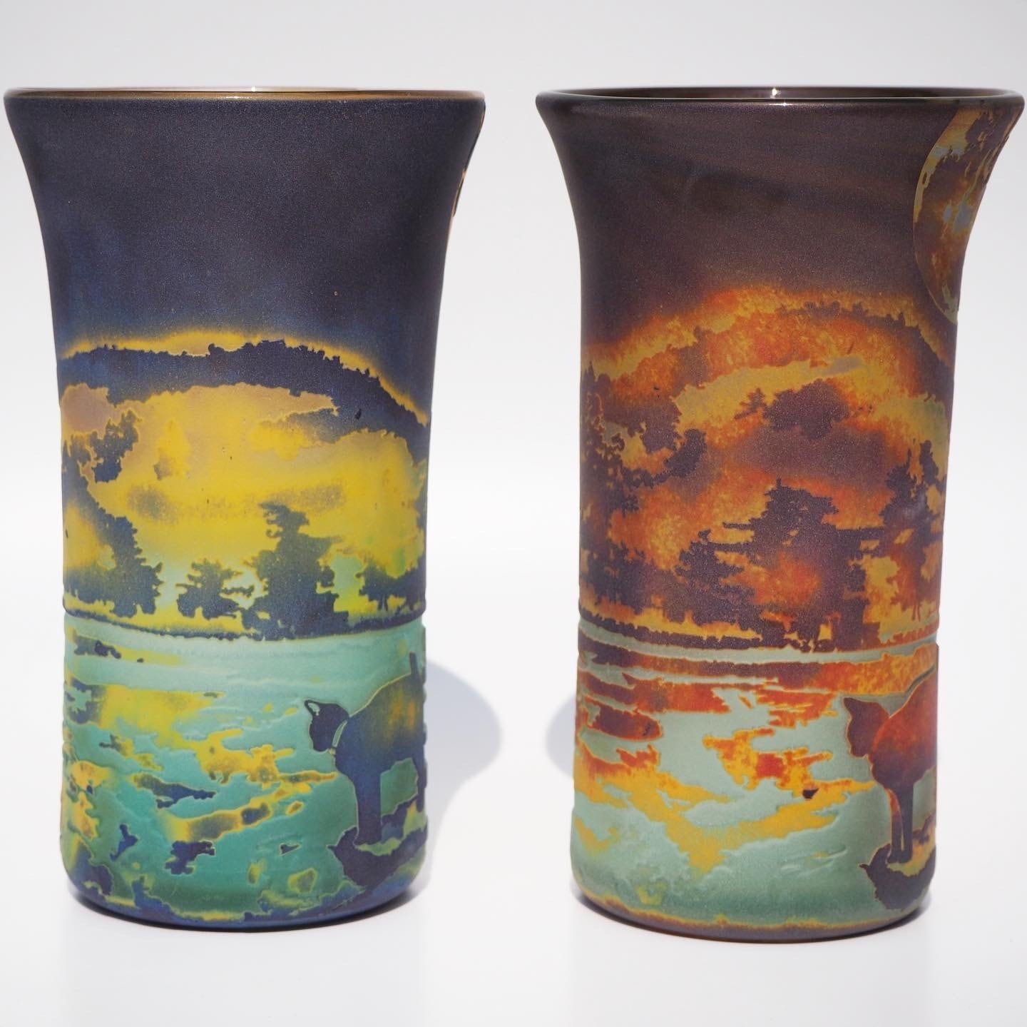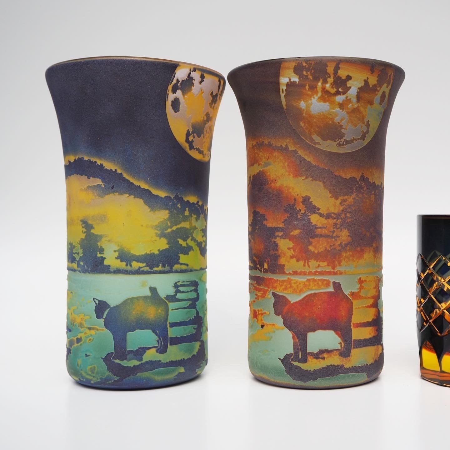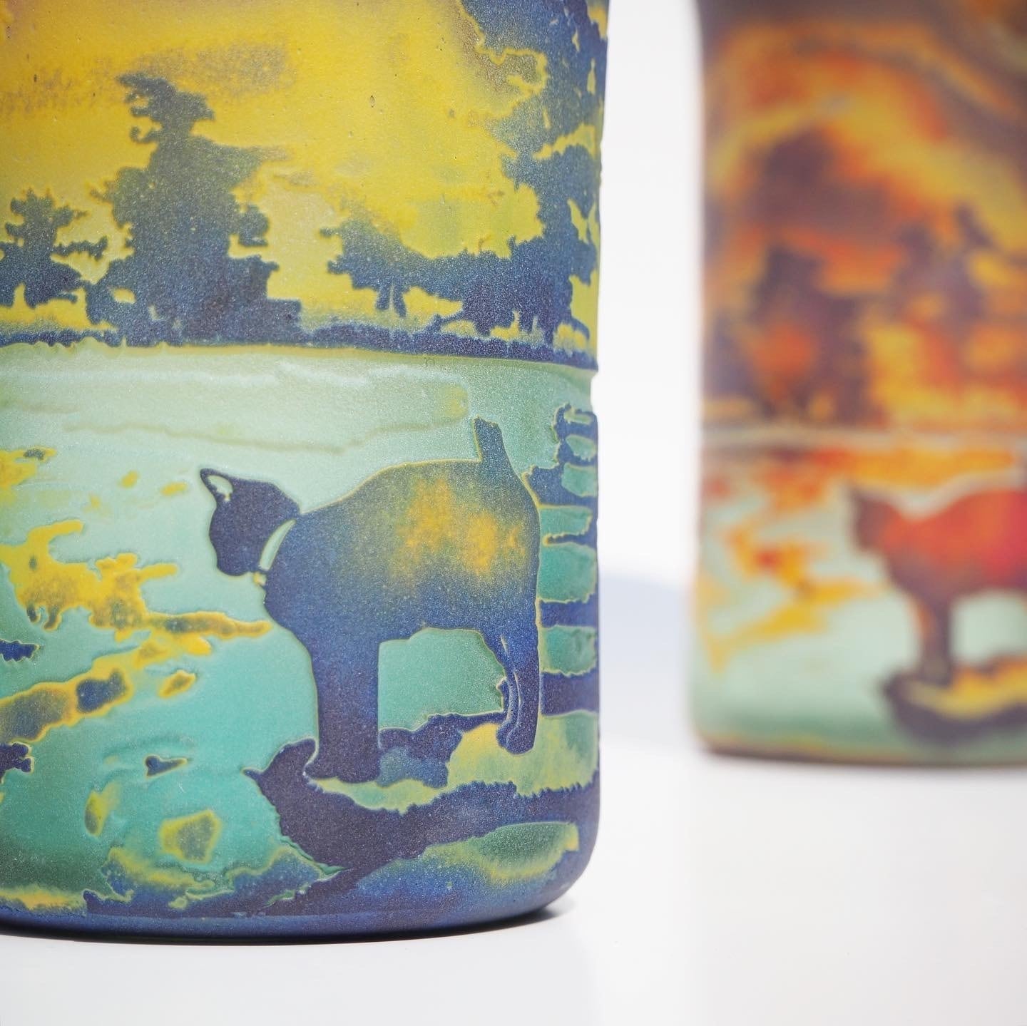 そこから数年後、ガラス作家として活動し始めた私は、この幻想的な写真をみつけ、ガラスで何処まで再現できるだろうかと挑んだのでした。幻想的な景色と猫というコンセプトはここから始まったのかもしれません。